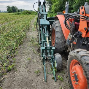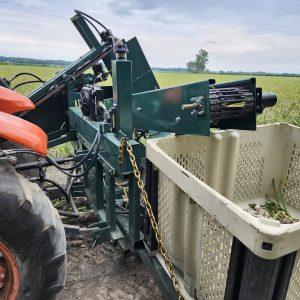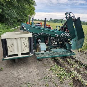 Willsie top pull harvester with cutting blades, best used for garlic, carrots, turnips and other root vegetables where it is necessary or preferable to pull from the tops. The belts pull the product up by the stem and the cuttings blades cut the product at the base of the stem so that only the bulb/head is carried over on the conveyor to the box.